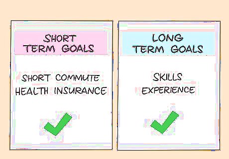 Balance your short-term goals with your long-term plans. You may have short-term goals you want your next job to accomplish, such as just having a source of income, but you should also keep your long-term plans in mind as you try to decide between two job offers. Ideally, you’ll want to choose the job that offers you perks, benefits, and experiences that also help you to achieve your goals in the long run. For example, if your goal is to eventually become a high-level manager of a company, choose the job that gives you some of your short-term goals (e.g., a short commute, decent health insurance) while also giving you the skills and experience you can use to achieve your long-term goals. When considering job offers, always ask yourself what opportunities for growth or moving up in an organization each job offers you. These may not seem relevant in the short term, but they’ll be very important in the long run.