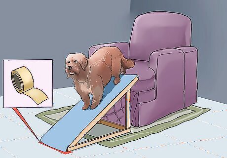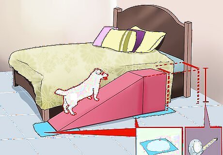 Build a furniture ramp. Depending on your circumstances, you may just need to build a ramp or have one custom built. After you’ve measured your dog and determined what furniture you need the ramp for, you’ll have the information you need to determine if you have to have the ramp built or not. If you can’t find a suitable ramp online, you’ll likely have to have a ramp built. Look for plans or designs online. If you can’t find a suitable one, spend a little time sketching the ramp you want to build. Buy wood at a store like Home Depot. Try to have it precut, if possible, to the specifications of your design. Assemble your ramp and cover it with inexpensive carpet to make it pet safe and comfortable.