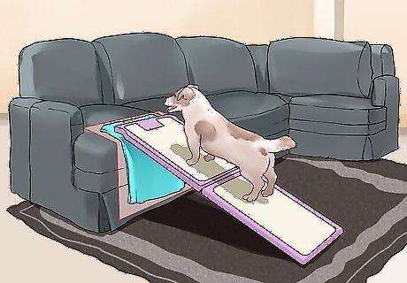 Pick a ramp for a couch. Couch ramps are an increasingly popular way for dogs, especially senior dogs, to access couches. Couch ramps make it easier for dogs to get on and off couches without jumping or struggling. Make sure you measure the distance between the floor and the top of the cushions on your couch so you know what size ramp to get. Consider the material the couch is made of. You may need to drape a blanket over the part of the couch the ramp connects with in order to prevent damage to the couch. If your couch is on hardwood or tile, you may need to purchase a rug or some sort of adhesive aid to prevent the ramp from moving as your dog walks up it.