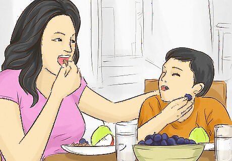 Offer fruit instead. When your child wants some juice, just say, “No, you can't have juice right now, but here is an apple.” Don't ask your child if they would like a piece of fruit instead of juice because the answer will probably be no. The whole fruit has fiber, whereas the juice does not, helping them to feel full. Juice contributes to your child's overall calories, but it doesn't help them feel as full. For instance, if your child asks for orange juice, ask if they want an orange instead. Similarly, you could offer an apple instead of apple juice, along with a cup of water.