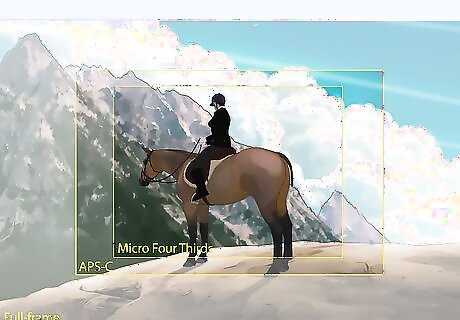 Determine the crop factor you need for your camera’s sensor. Part of the confusion in choosing lenses occurs because the same focal length might not produce the same result across different camera brands. This is because each brand uses a different sensor, and the projected image is cropped differently on those sensors. To determine the equivalent focal length for your brand, you’ll need to multiply the focal length by the crop factor. If you have a full-frame camera, there is no crop factor. If your camera uses an APS-C sensor, you’ll need to multiply the focal length by a crop factor of 1.5 to get the equivalent to a 35-mm format camera. Multiply the focal length by 1.6 if you have a Canon APS-C camera. The crop factor on Micro Four Thirds cameras is 2.0. The crop factor on a Nikon 1 camera is 2.7.
