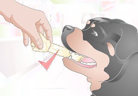 Give your dog a rawhide bone or chew to help remove plaque buildup. When your dog chews on a rawhide, the friction between the treat and your dog’s teeth helps to lift plaque and minimize tartar buildup. This creates a smooth, polished surface on the tooth, which prevent plaque from clinging to your dog’s teeth. Do not give your dog real animal bones or antlers. These can file down or break your dog’s teeth and cause injury. If your dog chews aggressively, do not give it small rawhide chips or sticks. Your dog may choke on these small treats. Give aggressive chewers a larger rawhide bone instead, and monitor your dog as they chew the treat.