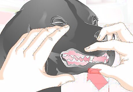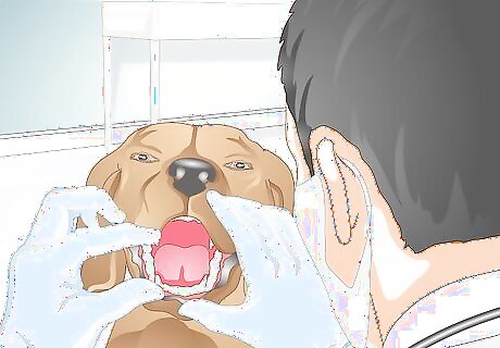 Exam your dog’s mouth and teeth. Looking for signs of gum disease or other dental issues is important for your dog’s overall dental health. A routine, at-home check-up can help you keep track of any developing problems. Share your findings with your veterinarian to help prevent more serious health issues from developing. Make sure your dog is comfortable while examining its mouth. Be gentle, speak to your dog in a calming voice, and give him praise or a treat afterward. With time and patience, your dog will get used to this examination routine. Check the symmetry of your dog’s face. Notice if there is any swelling, discharge, or growths. Gently pull back your dog’s lips and check both sides of its teeth and gums. If your dog’s gums are red, swollen, bleeding, or are sensitive to touch, your dog may have gingivitis. A yellow or brown discoloration around the gumline may be tartar buildup. Make note of chipped teeth or any bumps or masses within your dog’s mouth and discuss them with your veterinarian.