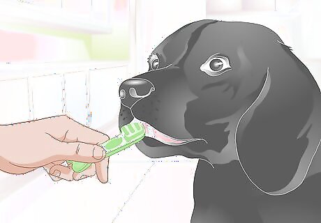 Give your dog a dental chew treat. A dental chew can help keep your dog’s teeth clean and can be a tasty treat for your dog. These treats come in a variety of shapes, such as crosses and toothbrush shapes, that help remove plaque from your dog’s teeth. They often come in a range of tasty flavors such as bacon, beef, and chicken. Mint flavors are also available to help freshen your dog’s breath. Be on the lookout for the Veterinary Oral Health's Council seal when looking for a dental treat to ensure the treat’s quality and effectiveness. Some dental treats contain fatty acids, antioxidants, or other vitamins and nutrients that support your dog’s overall health. Dental treats can contain added sugars. Be sure to read the label and discuss the sugar content with your veterinarian. This is particularly important if you dog suffers from obesity or diabetes.