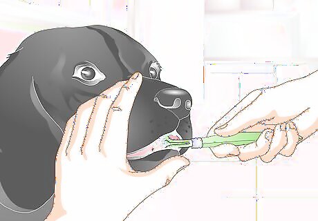 Brush your dog’s teeth. Weekly brushing is an important step in keeping your dog’s mouth free from plaque and tartar accumulation. If you’re feeling ambitious, daily brushing is even better! Use toothpaste and a toothbrush that are specifically designed for dogs. Place the brush inside your dog’s mouth at a 45-degree angle to its gumline, and gently move the brush across the outside surface of the dog’s teeth. The tongue often keeps the inner surface of the dog’s teeth free from plaque, so there is no need to brush this section. Give your dog praise or a treat when you have finished brushing its teeth. If your dog can’t stand having a brush in it’s mouth, try using a fingertip brush or a peice of gauze wrapped around your finger instead.