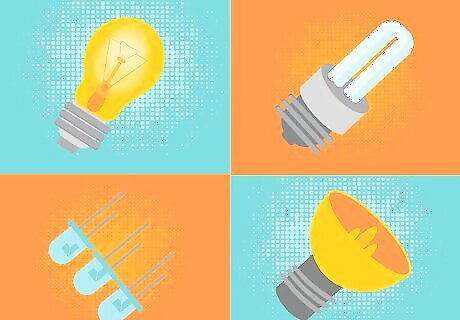 Consider the advantages and disadvantages of the different types of light bulbs. When it comes to lighting, there are 4 bulb types that are most used in the basement setting: incandescent, fluorescent, light-emitting diodes and halogen. Incandescent bulbs are very popular because they produce a bright, warm light that helps with creating a comfortable, cozy atmosphere. However, in recent years, they've been proven to be energy inefficient and often short-lived. These types of bulbs work best in areas where the lights will be turned on and off frequently, or in areas that have lights with dimmers. If you have concerns about long-term cost or environmental friendliness, forego the incandescent bulbs for more energy-efficient alternatives. Incandescent light bulbs are also being phased out across the world for more efficient alternatives. Fluorescent bulbs are quickly becoming the standard in energy efficiency, particularly because they last almost 10 times longer than the popular incandescent bulbs while requiring a third less energy. The main drawback to using fluorescent bulbs is that they give off a harsh white light reminiscent of warehouses and office buildings. Light-emitting diodes, or LED lights, are clusters of tiny bulbs with each bulb emitting a strong, beam-type light. LED lights can last over 10 times longer than fluorescent bulbs, but the initial investment is much higher, far more than both fluorescent and incandescent bulbs. This is offset by the high efficiency and low operating cost of LED bulbs. Halogen lights are more efficient than incandescent bulbs but not as efficient as fluorescent bulbs. However, halogen lighting produces some of the warmest and most radiant light out of the 4 bulb types. The disadvantage of halogen lighting is that it is limited in application; it works best for track lights and task lighting. If you are going to use halogen lights, it is recommended that you complement them with other types of bulbs.