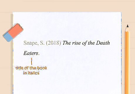 Type the title of the book in italics. Type a space after the closing parenthesis, then type the title of the book. Use sentence case, capitalizing only the first word and any proper nouns in the title. Place a period at the end of the title. If there's a subtitle, place a colon after the title and type the subtitle, also in sentence case. Example: Snape, S. (2018) The rise of the Death Eaters.Tip: If you accessed an eReader version of the book, place a comma after the title and type the words "eReader version," also followed by a comma.