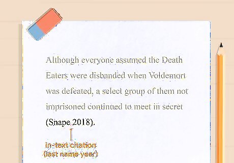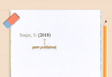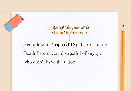 Put the publication year after the author's name in your text. In some situations, it enhances readability to refer to the author of a source directly in your text. In this situation, the parenthetical with the year goes immediately after the author's name rather than at the end of the sentence. For example, you might write: According to Snape (2018), the remaining Death Eaters were distrustful of anyone who didn't have the tattoo.