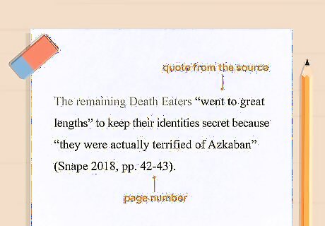 Add a page number or range if you quote from the source. When quoting directly from the source, place a comma after the year. Type the abbreviation "p." (for a single page) or "pp." (for a range), followed by the page number or range where the quoted material appears in the book. For example, you might write: The remaining Death Eaters "went to great lengths" to keep their identities secret because "they were actually terrified of Azkaban" (Snape 2018, pp. 42-43).Warning: Some institutions also require a page number if you closely paraphrase information from the source. Check with your instructor to be sure.