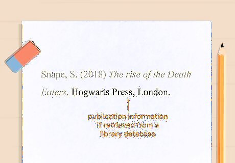 Close with publication information if the eBook was retrieved from a library database. For eBooks in a library database, the reference list entry includes the same information as the entry for a print book would. Add the name of the publisher, followed by a comma, then list the city where the publisher is located. Example: Snape, S. (2018) The rise of the Death Eaters. Hogwarts Press, London.