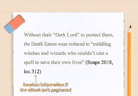 Use other location information if the eBook isn't paginated. If you accessed the eBook on an eReader device, you may not have page numbers. Instead, use a location number (loc), percentage, or chapter number to identify the location where the quoted material is found. For example, you might write: Without their "Dark Lord" to protect them, the Death Eaters were reduced to "middling witches and wizards who couldn't cast a spell to save their own lives" (Snape 2018, loc 312).