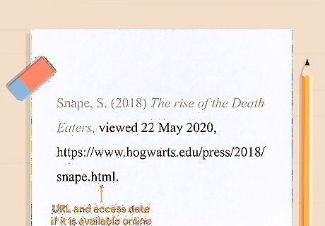 Include a URL and access date if the eBook is available online. If the eBook is available online, replace the location of the publisher with the URL where you found the eBook. Type the name of the publisher, followed by a comma, then type the word "viewed" with the date that you viewed the eBook in day-month-year format. Do not abbreviate the name of the month. Place a comma after the date, then copy the full URL. Place a period at the end of the URL to end your reference list entry. Example: Snape, S. (2018) The rise of the Death Eaters. Hogwarts Press, viewed 22 May 2020, https://www.hogwarts.edu/press/2018/snape.html. Similarly, if you downloaded an eReader version of the eBook online, you would list the access date and the website where the file is available. For example: Snape, S. (2018) The rise of the Death Eaters. Available at https://www.amazon.co.uk/kindlestore (Downloaded 22 May 2020).