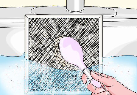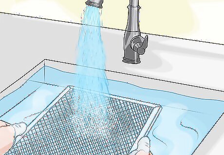 Scrub and rinse the filter. Use a soft-bristled brush to scrub the filter. You can also use a toothbrush to get into hard to reach crevices. After scrubbing away grease and grime, rinse the filter thoroughly with hot water to remove soap suds and residue.