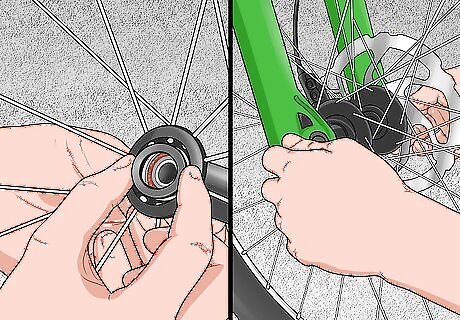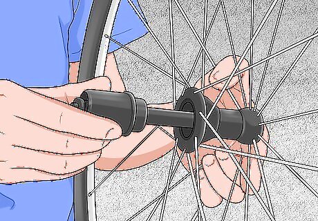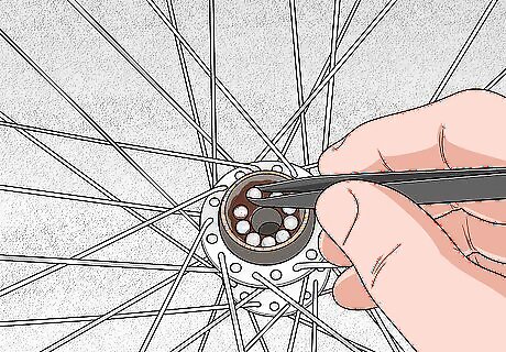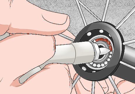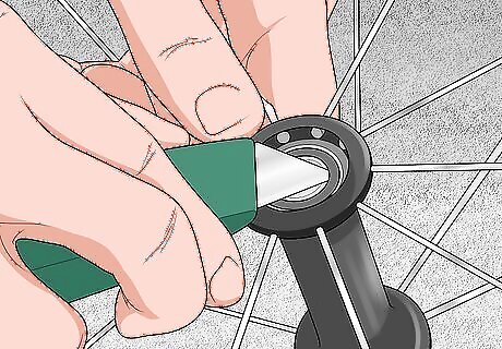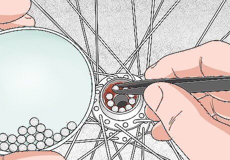 Insert the ball bearings back into each seat and add more grease. When replacing the ball bearings, it’s possible to miss the seat, causing the balls to drop through the hub and come out the other side. To prevent this, you can place the axle through the hub, but in the opposite way that it would normally fit. That way, the tip of the axle will prevent the ball bearings from falling through, making it easier to slide them into their seat. Pack even more grease into the bearing seat after you slide the ball bearings back into place. Once you’ve inserted the bearings one one side of the hub, repeat the process on the other side.