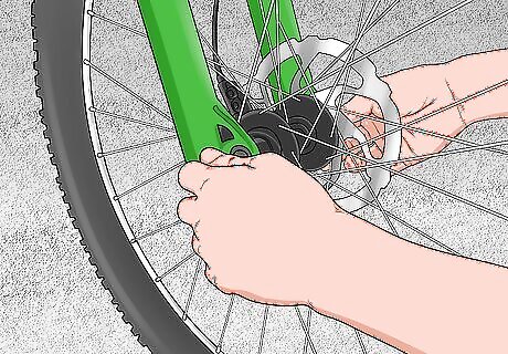 Take the wheels off of the bike. Many bikes have a quick release lever that you simply pull and turn counterclockwise. In addition to the quick release lever, most mountain bikes also have an axle that you’ll slide out after unfastening the quick release. Some bikes have heavy nuts that secure the wheels in place, which you can remove using a wrench.