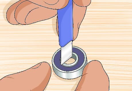 Remove the rubber or metal seals. Once you’ve popped the bearing casings out from the wheels’ centers, you’ll need to remove the seal to expose the ball bearings. If your bearings have a rubber seal, use a paperclip to carefully pry off the seal. Alternatively, you might have a metal seal secured by a C-clip. Use a utility knife to pry out the C-clip, then tap the metal seal out. You’ll be able to see the outline of the C-clip if your metal seal is removable. If the seal is pressed with no visible seam or outline, the seal is not removable and you will not be able to access the ball bearings.