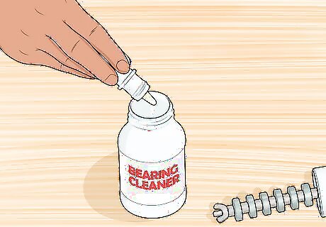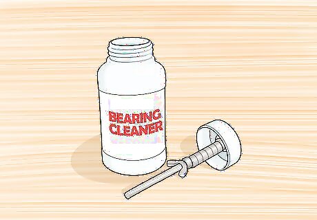 Fill the cleaning container with citrus cleaner, alcohol, or solvent cleaner. After stacking the casings, fill your kit container or bottle with a cleaner. You can use a citrus-based cleaner, 90% pure isopropyl alcohol, or a solvent cleaner, such as acetone. Each cleaner has pros and cons. A citrus cleaner is the safest choice, but might leave a residue on the casings. Isopropyl alcohol and acetone are stronger and won’t leave residue, but are skin irritants and emit hazardous fumes. Be sure to wear gloves if you choose 90% pure isopropyl alcohol or a solvent cleaner. Don’t use WD-40 or oil to clean ball bearings or bearing casings. These will just cause buildup without actually removing any debris.