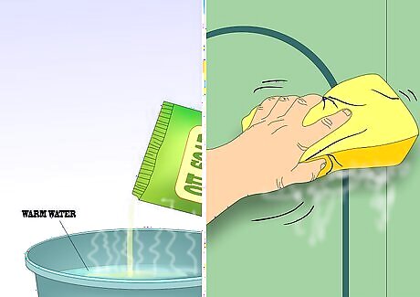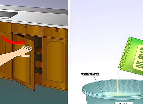 Close the cabinet doors. Place some oil soap in a container and dilute it with warm water. Then, test the oil soap on an inconspicuous part of the cabinet's surface to make sure that it does not harm the finish.