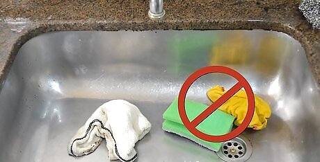 Keep wet rags out of the sink. You may place a wet rag somewhere in the sink when you finish doing dishes or wiping down countertops. While this is convenient, you should never leave wet rags or sponges in a stainless steel sink. Excess water can cause rust and stains. Store your wet rags somewhere else in your kitchen.
