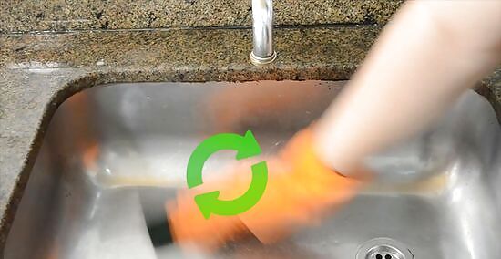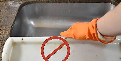 Rinse the sink to remove food particles. Turn on the water and allow food particles to flow down the drain. You can use a sponge to help guide the particles down the drain. In the event food is stuck on the sink, pour a small amount of dish soap on the sink and then rinse out with hot water.