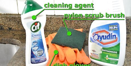 Gather the proper supplies. Once you've selected your product, get the right supplies. For washing the sink, you'll need a soft to medium nylon scrub brush. Anything more abrasive can scratch the surface of your sink. You also may want to wear dish gloves while cleaning. Read your manufacturer's instructions to select a cleaning agent. Stainless steel sinks are all made from slightly different materials. These materials respond differently to different types of cleaning products. To make sure you choose the right product for your sink, it's best to defer to manufacturer's instructions in regards to care, cleaning, and general maintenance. In the absence of instructions, use your best judgement and select a cleaning product recommended by manufactures and manufacturer's agencies in regards to stainless steel sink care. Products frequently recommended for a stainless steel sink are Fantastik Antibacterial Heavy Duty, Formula 409 Antibacterial All Purpose, Windex, Bar Keeper's Friend and Soft Cleanser, and stainless steel cleaner and polish. Olive oil can work if you’re looking for an organic option!