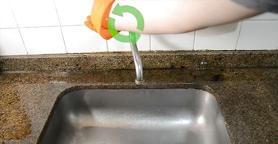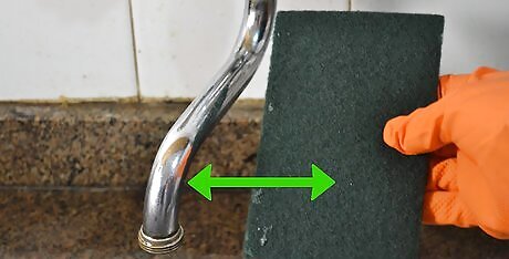 Wash the sink with warm water and a sponge. Apply your cleaner to your rag or brush. Brush the cleaner on, working in the direction of the sink's metal grain. Make sure to remember to clean off the faucet and the sink's handles, as grime often builds up on these places.