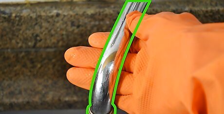 Rinse the sink thoroughly. Many cleaners contain bleach or other chemicals that can be corrosive to a stainless steel sink over time. Turn on the faucet and rinse the cleaner out completely. Make sure you keep rinsing until you no longer see any residue or bubbles from the cleaning product. Make sure to rinse off hard-to-reach places as well. Take a wet rag and wipe down the faucet, handles, and other places. Make sure to keep wiping until any residue is removed.