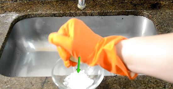 Try homemade remedies on stains. Some people advise certain home remedies for stains. While there's no guarantee such remedies will work, they're worth a try if you're struggling with a set in stain on your sink. Mix equal parts lemon juice and baking soda into a paste. Rub this paste over the stain with a damp sponge. Let the paste sit for 15 to 20 minutes, and then wipe the area clean. Mix a tablespoon of cream of tartar with a couple of drops of lemon juice. Rub this paste on rust spots and stains until they come off.
