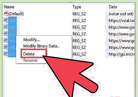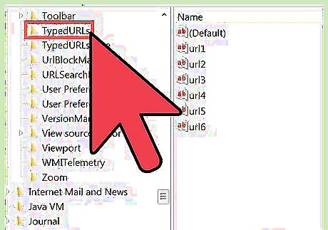 Delete entries. You can delete either individual URLs or groups of URLs. After deleting a URL, Internet Explorer will no longer show this URL in your history and will no longer suggest the website. You can delete every entry except for the topmost entry. This is the placeholder entry and does not hold any actual URL. Individual entries: Right-click on the URL entry under the "Name" header, click "Delete" from the dropdown menu. In the pop-up dialog box that warns you about deleting anything from the registry, click "Yes." Multiple Entries: Click and drag over multiple entries in the "Name" column. Right-click on any of the selected entries, click "Delete" from the dropdown menu, then click "yes" in the dialog box.