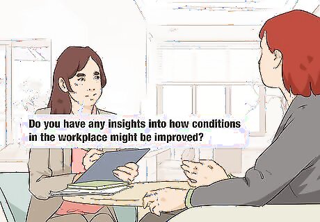 Learn how they think working conditions could be improved. Poor working conditions may have contributed to the employee wanting to leave, so it’s important to know this in order to prevent other departures. Even if working conditions didn’t influence the leaving employee, they may have good ideas on how to improve conditions in the workplace! Approach this question neutrally. Instead of asking “What was wrong with the workplace?” instead ask “Do you have any insights into how conditions in the workplace might be improved?” Ask them how they think the company is performing overall, as well. Try to get as much insight as possible that you can then apply to improving your organization.