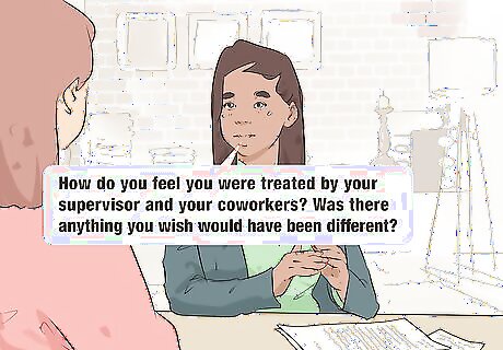 Ask how they feel they were treated by the company and its employees. It’s important for you to find out whether the work environment of your organization contributed to the employee’s decision to leave. Ask if they feel they were treated fairly by their supervisor or if they liked their employees. A good way to phrase this question might be: “How do you feel you were treated by your supervisor and your coworkers? Was there anything you wish would have been different?” Ask the employee how they think their coworkers feel about their leaving. This will give you good insight into what role, if any, their relationship with other employees played in their leaving.