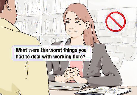Avoid asking targeted or negative questions about specific people. Not only would this type of question make the exit interview more negative; it could also be construed as slander. Some examples of questions to avoid include: ”Do you think there’s someone else who should leave instead of you?” ”Was there anyone you hated working with?” ”What were the worst things you had to deal with working here?”