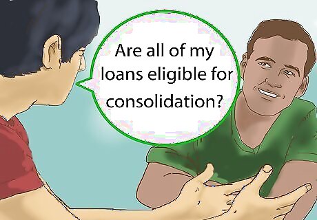 Ask questions. There are many people who can help you decide which consolidation path is right for you. Talk to your current lender and discuss your options. Consider asking the following questions: “Are all of my loans eligible for consolidation?” Most federal loans can be consolidated with the Department of Education. However, private lenders set their own rules. “If I consolidate my loans with the Department of Education, do I lose anything?” For example, you might lose any credit you have earned if your loans are currently on an income-driven repayment plan. “Can I consolidate if my loans are currently in default?”