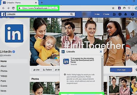 Message LinkedIn customer service through their Facebook page. Visit LinkedIn’s official Facebook page by typing https://www.facebook.com/LinkedIn/ in your browser’s address bar. From there, a pop-up messenger window will automatically open in the bottom right corner of the page. You can type your question and upload related documents or screenshots directly through that window. If the pop-up doesn’t automatically come up or if you accidentally close it, just click on the grey box that says “Send Message” in the middle-right of the profile page.