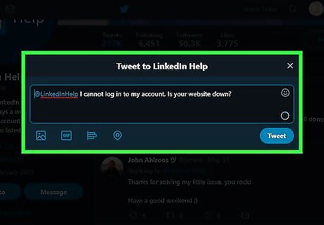 Tag @LinkedInHelp in a tweet to get a response to a simple question. @LinkedInHelp is the company’s customer service Twitter profile. They reply to tweets with helpful information and resolve issues through tweets. Keep in mind your tweets are limited to a certain number of characters, and posting your question this way makes your question and any accompanying information public. Stick to simple, short questions that do not reveal personal information for this method. An example of a question you could ask through Twitter is, "I cannot log in to my account. Is your website down?" This type of question addresses a broad and impersonal issue, and can help other users who may also be having connectivity issues.