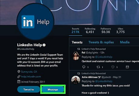 Send @LinkedInHelp a direct message through Twitter. To send a direct message, visit @LinkedInHelp’s Twitter page at https://twitter.com/linkedinhelp and click on the blue button located on the left hand side that says “Message.” A pop-up window will open up in which you can type your message, and also attach pictures to documents to support your request. This option is great if you have a longer question or need to share more personal information to get your service request fulfilled.