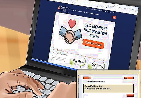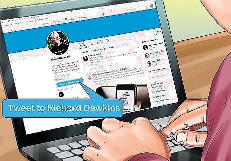 Leave comments on blog posts he writes on his website. Though not all the blog posts are written by him, you can find articles that Dawkins wrote on his website. A comment on his post shows you took the time to read it and gives you a space to comment or ask questions. Visit his site here: https://www.richarddawkins.net Keep your comment related to the topic of the blog post rather than asking personal questions. Start discussions with other commenters to delve further into the topic and participate further.