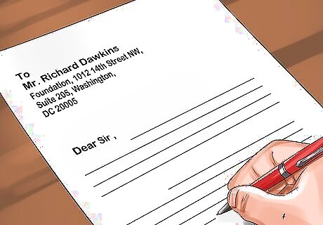 Write a one-page letter to Dawkins. Keep your letter short so he isn’t overwhelmed by the length. Split paragraphs up by double spacing them or leaving a line between them. Address him as Mr. Dawkins or Mr. Richard Dawkins in the heading of your letter. You can either type the letter or hand-write it. Just be sure your handwriting is legible. Be specific about what you’re writing about, like why you’ve connected with something he wrote or how he has inspired you. Always check your spelling and grammar before sending your letter.