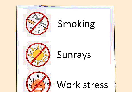 Avoid triggers at work. Smoking, sun exposure, and stress are common triggers at work that can cause psoriasis flare-ups. Adjust your habits to protect yourself from triggers: Quit smoking, and stay away from second-hand smoke. If your co-workers are smoking, excuse yourself for some fresh air. Cover sun-exposed areas with pants and long-sleeved shirts made of light, breathable material. Wear a wide-brimmed hat to protect your face from the sun. Always wear sunscreen when outdoors. Reduce your stress at work by doing short meditations at your desk. If you work outside, take five minutes out of every few hours to do gentle stretches and deep breathing. If you work in a high-stress environment, practice mindfulness or see a counselor to learn stress management skills.