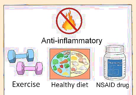 Reduce inflammation. The red patches caused by psoriasis are sites of inflammation. To relieve your symptoms, take measures to reduce and prevent inflammation in your body. Exercise can reduce inflammation and stiffness. Outside of work, try incorporating exercises like walking, swimming, and yoga into your life. At work, aim to stand and walk around at least once an hour. An anti-inflammatory diet, in which you eat foods known to reduce inflammation, may help provide relief. Leafy greens, fruit, and foods with Omega-3s like olive oil may all help. Ask your doctor about taking a nonsteroidal anti-inflammatory drug (NSAID), such as ibuprofen, aspirin, or a prescription drug. These can relieve inflammation and pain.