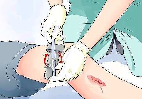Prepare the necessary materials. You’ll need: Combat Application Tourniquet - you can purchase one online or at your nearest medical supply store. If you do not have one readily available, you can use alternative material like a rope, belt, or elastic bandage. Two or three sterile dressings or a clean cloth. Sterile gloves. Medical tape. Scissors.
