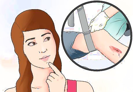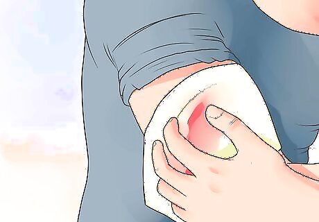 Take the sterile dressing or clean cloth and apply direct, firm pressure to the wound for five minutes. Applying direct firm pressure into the wound without interruption stops bleeding by compressing the sides of the torn blood vessel, thus reducing blood flow. If the sterile dressing or clean cloth is already soaked, get another one and put it on top of the first sterile dressing or clean cloth. Doing this will help to absorb more blood from the wound.