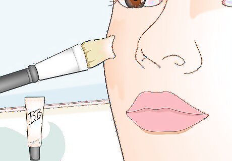 Apply oil-free foundation or BB cream with a foundation brush. Use a liquid foundation or BB cream that matches your normal skin tone. Pick up a small amount with a foundation brush and tap the foundation all over your face. Blend out the makeup with the brush, starting in the center of your face and working your way out toward the hairline. Look for an oil-free and fragrance-free foundation to prevent additional irritation. Avoid applying heavy foundation to sunburned skin. Stick with a lightweight formula. BB and CC creams are great options. Use a foundation with yellow undertones to conceal any remaining redness.