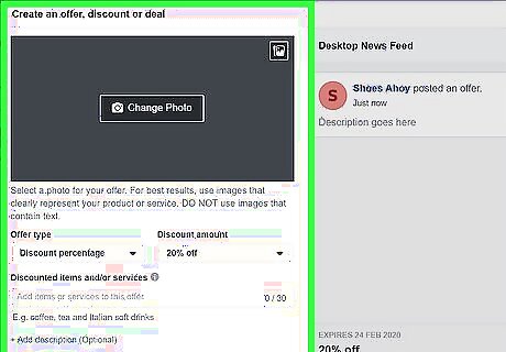 Create and describe your offer. You should add a photo, description, offer type, what items or services the offer is good for, expiration date, and redemption instructions. You can also add terms and conditions in the bottom-left area of the window.