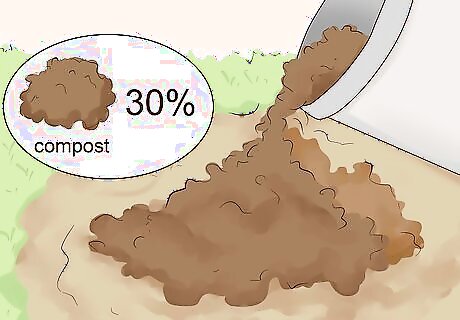 Fill the basin with soil. After you've dug out your garden and added a berm, add soil to your rain garden. You can use pre-mixed rain garden soil, or you can use general gardening topsoil. Mix compost with your soil before adding it into your garden, as it will provide nutrients that may be lacking in the soil. Your soil's compost content should be around 20-30%. The clay content in your soil should be minimal. Take a handful of soil in your hand and squeeze it. If the soil stays clumped together and doesn't fall apart when prodded, your clay content is too high and you’ll need to amend the soil.