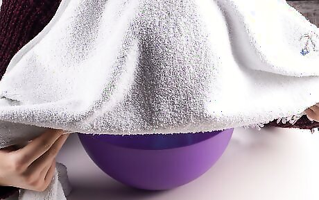 Lean your face over the bowl or basin. Place the basin on a table so you can sit in a chair and lean over the steaming bowl. With your head over the basin, place the towel so that it's draped over the back of your head and completely over the bowl. This will prevent steam from escaping. Be careful not to lean too close to the hot water.