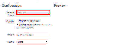 Configure. On the next page are the configuration options for the widget. You may set width and height in pixels, the number of tweets per page, the header background color, and the header text color.