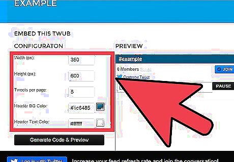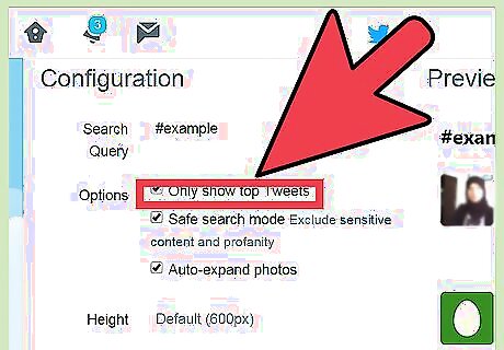 Configure the settings. Select whether or not you’d like to only display “Top Tweets,” if you want the widget to be in “Safe Search Mode,” and whether you want to “Auto-expand photos” by clicking the corresponding checkboxes. Select the height in pixels you’d like the widget to be. By default, it’s 600px. The next option down whether you want the contrast of the widget to be light (dark text on light background) or dark (light text on dark background). Pick what color you’d like links to be. You can either use an HTML color, or select from a color picker.