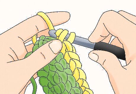 Skip 1 stitch and single crochet into the following 6 stitches. To make your chevron point back up in a diagonal direction, skip the next stitch. Then, continue to make a single crochet stitch into the next 6 stitches of your first row. As you work, you'll see the crocheted strip begin to angle up and down diagonally.