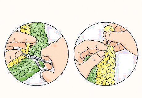 Cut the yarn tail and weave in the ends. Use scissors to cut the working yarn so there's at least a 6 in (15 cm) tail. Then, thread it onto a tapestry needle and weave it into the blanket. Don't forget to weave in the tail from the opposite end of the blanket.